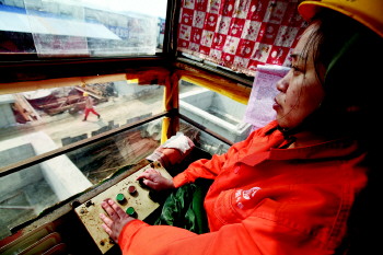 2011年,33岁的樊桂英跟随丈夫从北京来到了青岛,抱着想和丈夫在一个单位工作的信念,樊桂英专程到延安接受了一个月的特殊工种培训,并专门学习了龙门吊的操作技巧,考出了特殊工种上岗证。“龙门吊那么高,虽然我没有恐高症,但是第一次爬上去还是挺害怕的,不过后来慢慢也就适应了。”樊桂英说,对于她而言,一天攀爬十多次到操控室,或者在寒冷的冬季开着窗户、迎着海风作业已经习以为常了。“已经一年多没回家了,下次回家也得等明年春节了,想家啊!”樊桂英说。
