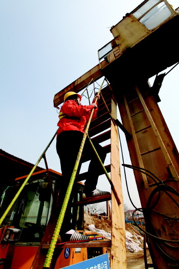图二:樊桂英攀爬龙门吊的动作十分娴熟。