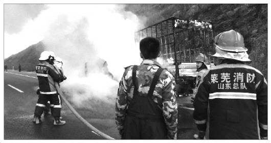 本报3月6日讯(记者 王浩奇 通讯员 刘彬) 5日17点15分,莱芜市公安消防支队指挥中心接到群众报警称,在济青高速往青岛方向过铁车隧道附近一辆货车失火,情况危急,急需救援。接到报警后支队指挥中心迅速指令辖区鹏泉中队立即出动3辆消防水罐车,18名消防官兵“火速”赶赴现场救援。