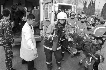 一名被困伤员被抬上救护车。本报记者 马志勇 摄