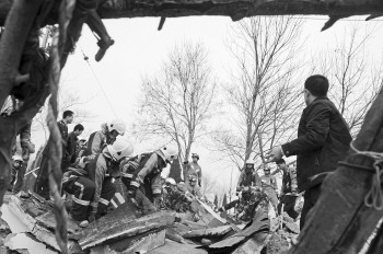 在北面靠墙位置,一名被困人员头部受伤,腰部以下被压在多个水泥板下,医护人员先给他输上氧气。另两人被埋在南面。众人手抬肩扛抬起石板,救出两人,然后又在吊车帮助下救出第三名被困人员。