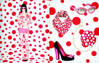说到艺术与时尚跨界,不得不提的是现年已经85岁的日本当代前卫艺术家草间弥生,草间弥生是目前日本仍在世的伟大艺术家,也是人们口中的“精神病患者”。由于她儿时罹患神经性试听障碍,从幼时起就生活在精神病疗养院,直到今天。神经性试听障碍让草间弥生看到的世界永远布满了斑点状的网,这些彩色的无穷无尽的圆点,令人混淆了真实与虚幻的空间,给她带来了晕眩和迷幻的错觉。1939年起,她便将这些鲜艳的波点图案覆盖在一切物品上,那些看似普通的玻璃杯、金鱼、花朵、大南瓜变得艺术起来。后来草间弥生还将这些波点元素运用到布料、树木、房间、雕塑、服装设计上,这种装饰性极强的绘画作品被评论家认为:包含了女权主义、极简主义、超现实主义、原生艺术、波普艺术和抽象表现主义等。