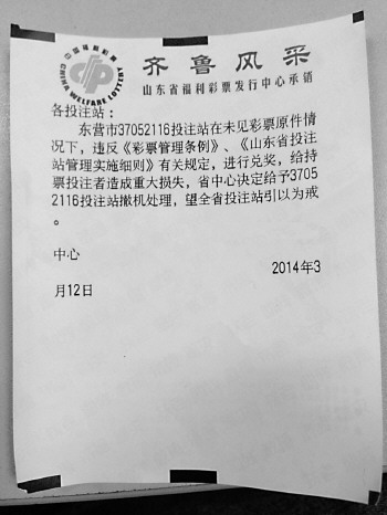 12日,山东省福利彩票发行中心下达通知:东营市37052116投注站在未见到彩票原件情况下,违反彩票管理条例、《山东省投注站管理实施细则》有关规定,进行兑奖,给持注者造成重大损失,省福彩中心决定对该投注站进行撤机处理。