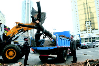12日,几辆货车将解放路的槐树拉走。据了解,为方便市民出行,解放路与二马路交叉路口将进行交通渠化改造,路边的槐树会阻碍工程进行,因此被挖出移植到上曲家苗圃。