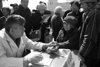 13日,德州市中医院在中心广场举行大型义诊活动,活动现场众多市民耐心排队等待专家诊治。