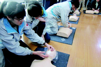 13日,在青岛15中,天使紧急救援中心的志愿者为该校学生志愿者进行自救互救技能培训,作为该校志愿者节系列活动之一,学生志愿者将学习心肺复苏、结绳逃生、烟雾逃生、灭火器使用等。图为学生在学习如何做心肺复苏。