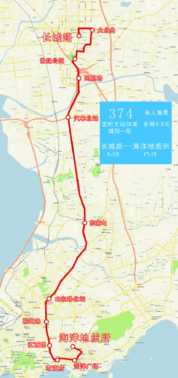 374路“定时快车”在缩减站点的基础上,还适当调整了线路走向,即减少了“长城路—城阳批发市场—正阳路”段,公交车行驶时,从长城路直接右转到正阳路、重庆路行驶。如此一来,单程的行驶里程从原来的40公里缩短至38公里左右,预计单程运行时间比普通公交线路减少30分钟以上。“定时快车”与普通374路车辆交替发车,并不减少原有班次。两趟“定时快车”均有标志牌,请乘客认清标志乘车。