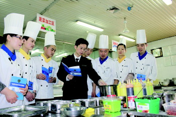工作人员对餐饮从业人员进行现场培训。