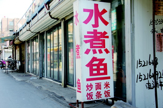 走进剧场街,远远地就看见一块“水煮鱼”的招牌竖在路边,那就是此行的目的地。还不到中午12点,店内已座无虚席。老板崔先生知道我们要来,早就提前预留了位置。此时正是店里最忙的时候,崔老板热情地招呼我们坐下,就急忙钻进厨房忙活起来。