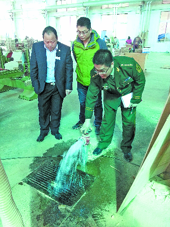 消防人员检查胜辉木业公司内的消火栓。 本报记者 尉伟 摄