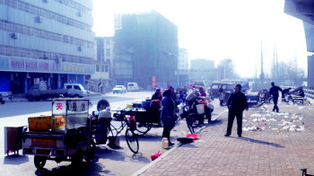 16日上午9点多,还没走到运河路高架桥下,记者就看到整个人行道上都摆满了早餐桌,桌下垃圾遍地,虽有人清扫,但路上油渍仍清晰可见。十几辆卖早点的三轮车排放在机动车道上。几个摊贩甚至将三轮车停在了下桥的入口处,使原本就不宽的路口更显狭窄。记者看到,从桥上下来的道路坡度较大,且来往车辆速度较快。车辆下桥还需向北拐,如司机对此处不熟悉,很容易直接冲进路边的早点摊中。