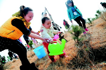 16日上午9点多,本报30多名小记者跟着家长,兴奋地领取了工具,就朝山上跑去,大人们也追赶不上他们的脚步。因为对于不少小记者来说,这是他们第一次走上山头,亲手植树。