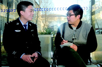 本报记者与民警张德龙交流。 本报记者 邓兴宇 摄