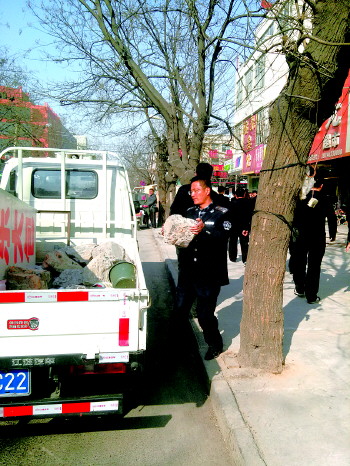 城管队员清理商贩用于压摊位的石块。
