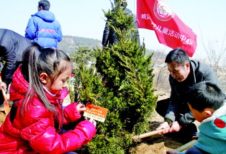3月15日,在环山路陶家夼路段的山上,威海市妇女儿童活动中心的工作人员与50多位小朋友及家长义务植树。一上午时间,共植黑松、龙柏100多棵,小朋友们还为种下的苗木系上了标有自己名字的挂牌。