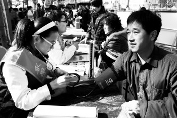14日上午,在“3·15”活动现场,东昌府人民医院的医生正在为市民测量血压。当日,本报与东昌府区人民医院联合举办的义诊活动服务了百余市民。