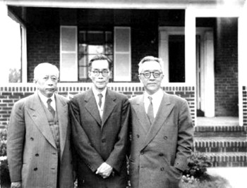 1954年,梅贻琦在美国与友人胡适(右)、缪云台(左)合影。