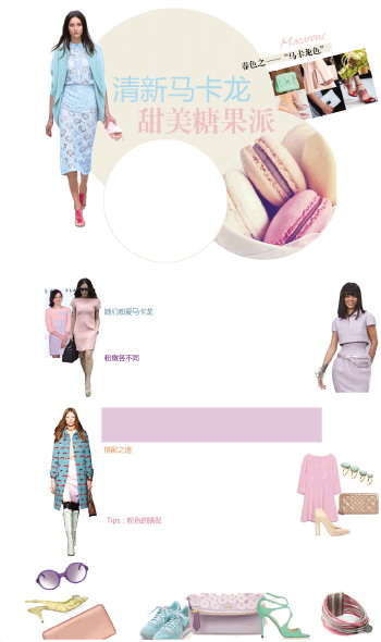 马卡龙是法式甜点的代表,去法国如果不尝试地道的马卡龙,可能比没有在埃菲尔铁塔下留念还要遗憾。而那些粉嫩的色彩也随着人们对它的喜爱火遍全球。尤其是从2012年起,它频繁地出现在时装秀场上,从服饰到妆容,都染上清新柔美的质感。在2014春夏季,水彩色的风潮再度席卷T台,并且在配饰设计上表现的尤为突出,比荧光色更温柔、比糖果色更清新,水彩色的包包、鞋履等配饰,成为2014春夏季抢眼的着装点缀。