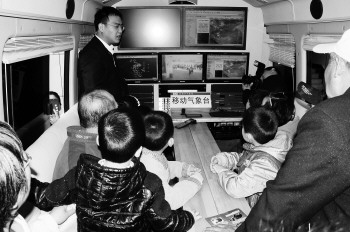 在市气象局楼下的气象应急指挥车吸引了大批学生和家长的围观。“这是转播天气预报的吗?上面怎么还有一个风车?”一名小学生指着气象应急指挥车里的电脑屏幕,好奇地问气象局的工作人员。“上面的是风杆,用来测量风速、风向。”气象局工作人员李先生介绍说。随即,气象局工作人员在气象应急指挥车上向市民演示了天气情况监测和测量风速、风向。