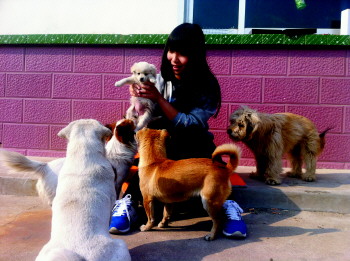 王晓杰正在照顾她收养流浪猫狗。