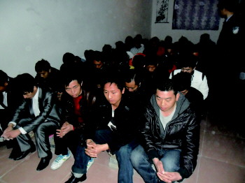 执法人员看到,在一个不到50平米的屋内,正有40多人坐在水泥砖块上听课,现场还有一块小黑板。另外一个房间内,还有一个简易的床铺,凌乱地放着一些衣服。执法人员和民警将现场的人群控制,随后送往派出所进一步审问。