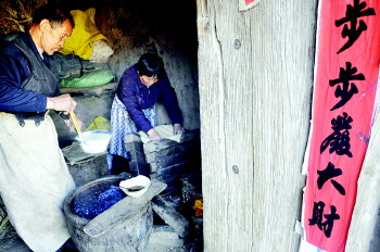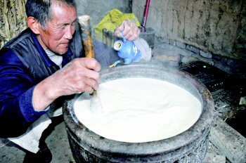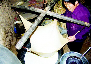 耿家厚的爱人在将豆浆过箩。