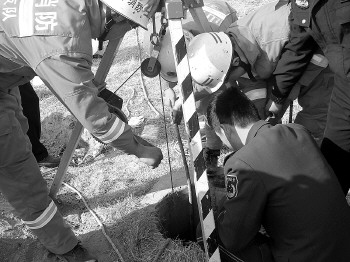接到报警,巨野消防大队光明中队官兵赶到现场时,一群村民正焦急地围在机井旁,井口放有一根绳子。消防战士通过探照灯依稀看到十七八米深的井下有一个人头在晃动,落井人手里正抓着绳子在等待救援。在对现场仔细侦查之后,中队长董贺立即命令战士用绳子拴住一个空气瓶,慢慢送到井内对老人进行输氧,避免井内缺氧造成老人窒息。同时,指挥消防战士紧急架设三角支架,准备下放安全带套在老人的腰部进行救援。