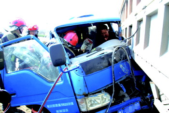 消防官兵在解救受困的司机。