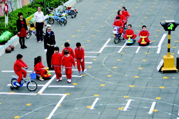 本报3月25日讯(见习记者 刘光斌) 25日,张店区实验幼儿园邀请张店交警大队来到幼儿园,模拟十字路口情景,设置斑马线、机动车行道及红绿灯等,由交警指挥,对该幼儿园大班140名儿童进行了路口交通模拟教学。