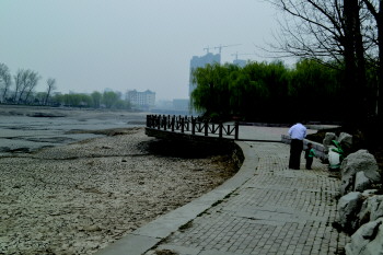 在淄川留仙湖公园南区沿湖处,两边的景象形成了鲜明的对比。东边草木生长,给人一种春天的感觉。而西边却因为湖水已被放光,淤泥地在阳光的照射下,龟裂得仿佛如干旱的土地一般。