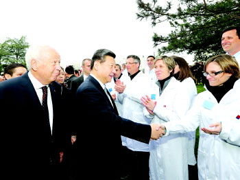 26日,习近平和夫人彭丽媛抵达时,梅里埃集团总裁阿兰·梅里埃率家族成员以及该中心员工列队热烈欢迎。