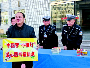 交警为爱心图书室捐书。