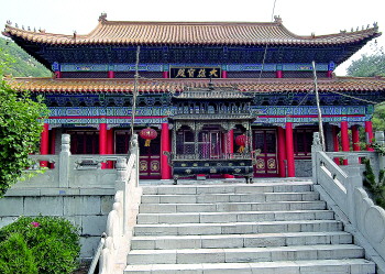 进山门,跨过放生池上的小拱桥,迎面就是大雄宝殿。大雄宝殿为重檐歇山顶建筑,殿广五间,进深三间,四周回廊,大红廊柱,彩绘梁枋,额题“大雄宝殿”。出大雄宝殿往北不远处就是观音阁,阁高三层,整座建筑位于高高的台基之上。在通往观音阁的台阶上,建有一座汉白玉凉亭,亭中塑有观音菩萨全身立像,台阶之下为莲花池,池中设桥,桥上塑有两条金龙。