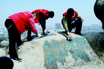 一段时间以来,某些游客在山上乱涂乱画。护驾山公园里大大小小的石头,被游客用油漆、自喷漆涂画上“到此一游”、表白或无厘头的字眼,破坏了山上的自然景观,护驾山在“哭泣”(本报2013年12月20日曾报道),严重影响了市容市貌和登山市民的心情。