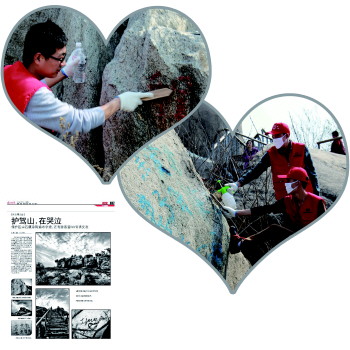 当天,40多名志愿者前往护驾山公园,清除涂鸦、清理垃圾。当天,志愿者们带着爱心企业提供的20多桶“香蕉水”,登山攀石,忍着清洗剂的刺鼻气味儿,共清理各类山石涂鸦40余处。