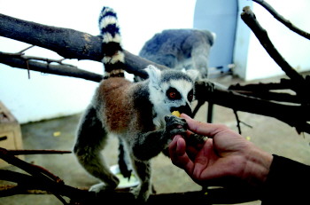 ▲一只环尾狐猴正在吃饲养员递过来的食物。