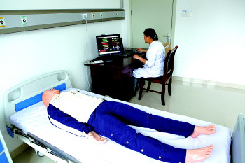 培训中心的高仿真模拟人是从瑞典进口的,能模拟正常人的呼吸、心跳、血压等各项生命体征。通过电脑操控,可模拟出急性心肌梗塞、呼吸衰竭、急救创伤等各类疾病。医生通过对模拟病人的诊断、治疗,可以获得以前只能在临床一线病人身上才能获得的经验。