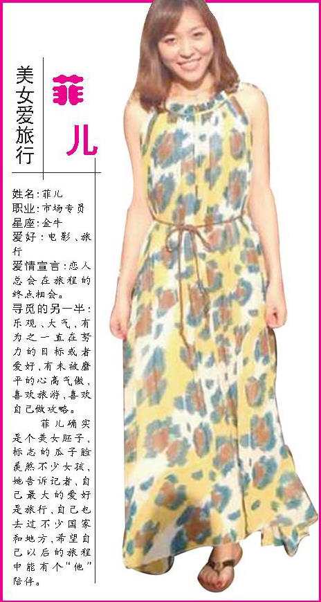菲儿确实是个美女胚子,标志的瓜子脸羡煞不少女孩,她告诉记者,自己最大的爱好是旅行,自己也去过不少国家和地方,希望自己以后的旅程中能有个“他”陪伴。