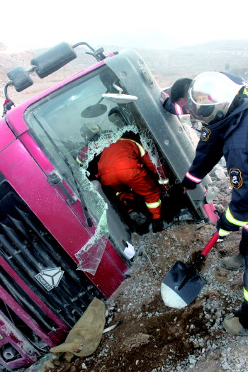 26日16时许,淄川区龙泉镇一辆满载石料的自卸车在下坡途中,刹车不及时,撞在路口土堆上侧翻,司机被困驾驶室,半个身子埋在土中。市公安消防支队般阳中队的消防官兵赶赴现场,徒手挖土将司机救出。
