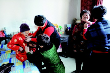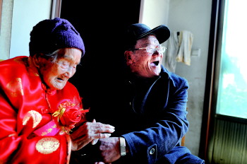 ▲16日,孔张氏老太太过百岁生日,来贺寿的亲戚握着她的手开怀大笑。