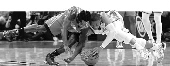 贝弗利与威少在比赛中争球。