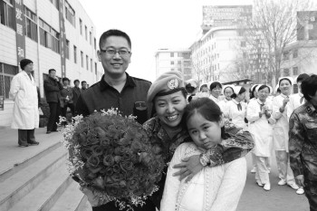 与刘玉强一同归来的还有维和队员张静和李翠萍,这两位女队员也忍不住与家人、同事拥抱在一起,久久不愿分开,围观的医护人员,医院的战士以及市民都忍不住抹起了眼泪。