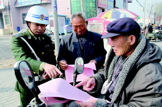 ◥路政大队的工作人员正在向村民解释路政法律法规的相关规定。 本报记者 王泽云 摄