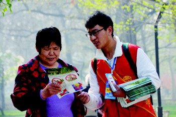志愿者在市人民公园向市民介绍文明祭祀。