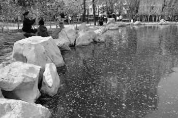在市人民公园的湖面上飘上了一层杨絮。