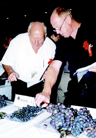 2003年8月29日,诺博(左)和汉斯在鉴评所引进葡萄的品质