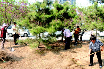 14日,工作人员正在清除天衢东路绿化带内的老化草皮,此路段的草皮为2009年种植,目前出现大面积老化枯萎,将进行统一清除,重新绿化。 本报记者 马志勇 摄