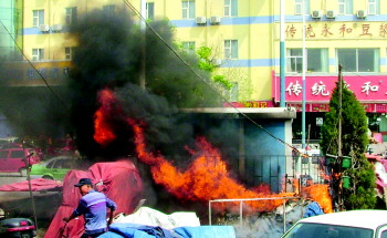 本报泰安4月14日讯(记者 张伟 赵兴超) 14日下午,龙潭路与东岳大街路口南侧路西,一处杂物堆突然起火,险些烧到紧邻的变电箱。附近一家手机卖场员工用了八只灭火器扑灭大火。