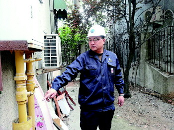 16日,检查人员发现,济南饮虎池街灰口铸铁管被旁边的违章建筑压盖,一旦断裂泄漏,极易发生爆炸。 本报记者 孟敏 摄