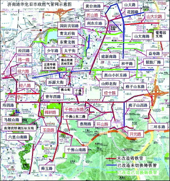 图为16日济南港华燃气公布的省城部分地区危旧市政燃气管网示意图。红色为未改造铸铁管,蓝色为已改造铸铁管,绿色为已改造已切换铸铁管。